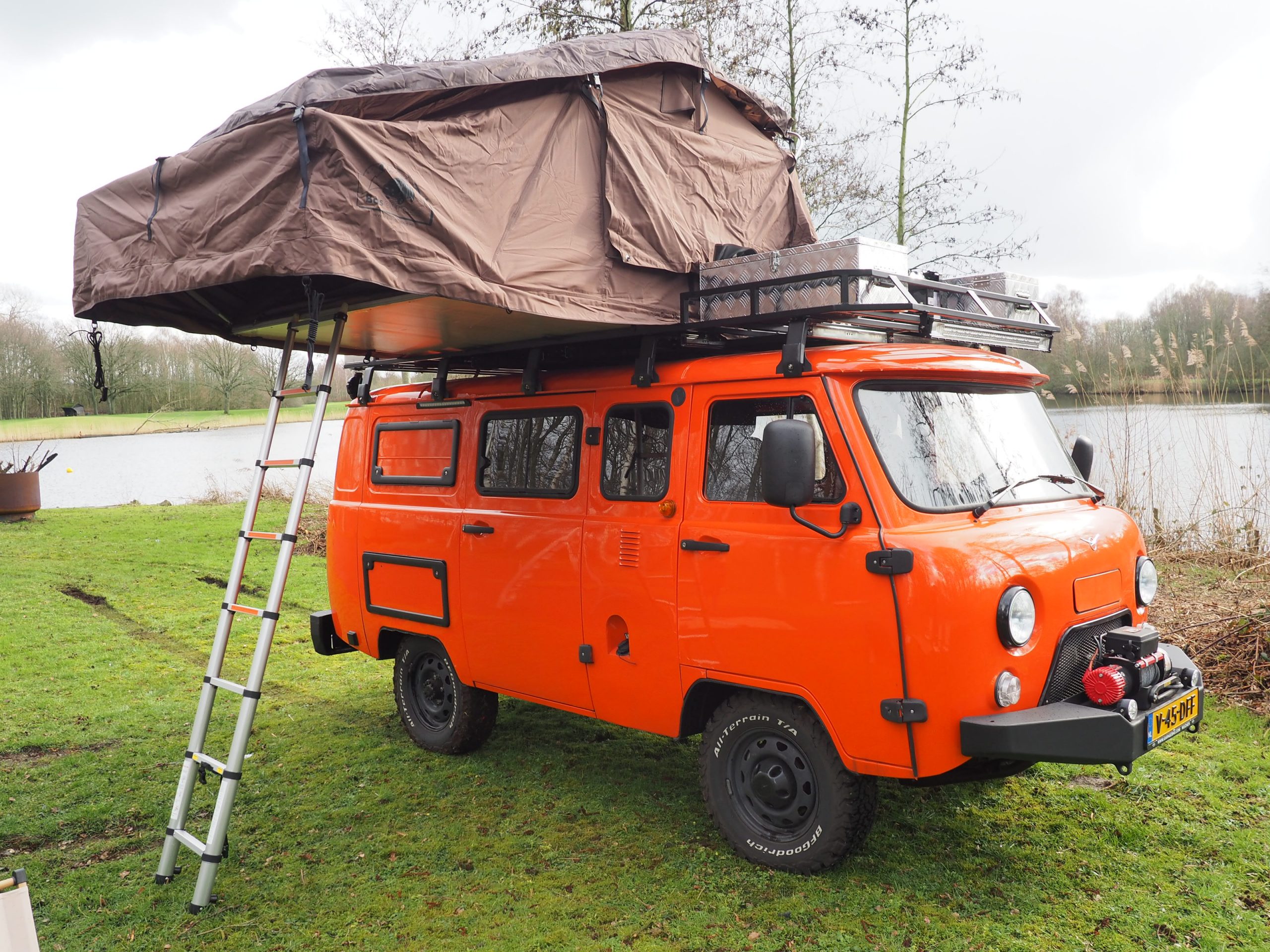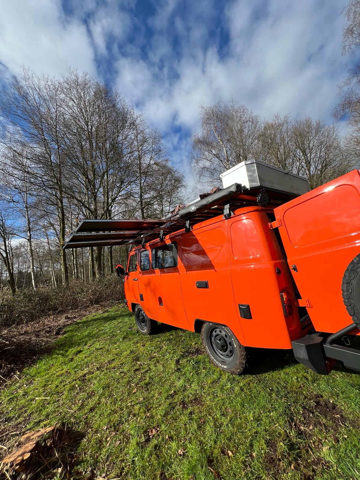 Onze tweede UAZ Bukhanka camper is bijna klaar om te huren. Het is een volledig ingerichte expedition camper voor 5 personen. Deze camper is speciaal ingericht voor het off grid kamperen. De camper biedt 5 zit- en slaapplaatsen en beschikt over een buitendouche met warm water, een schoon watertank van 80 liter en een buitenkeuken. Ook is er voldoende kastruimte. Verder heeft de camper 3 uitschuifbare zonnepanelen, zodat er altijd stroom beschikbaar is. Aan onze XXL daktent kunnen ook wanden geritst worden, zodat er een afsluitbare ruimte gecreëerd kan worden. De camper bezit tevens over een compressor zodat de banden opgepompt kunnen worden waar nodig.