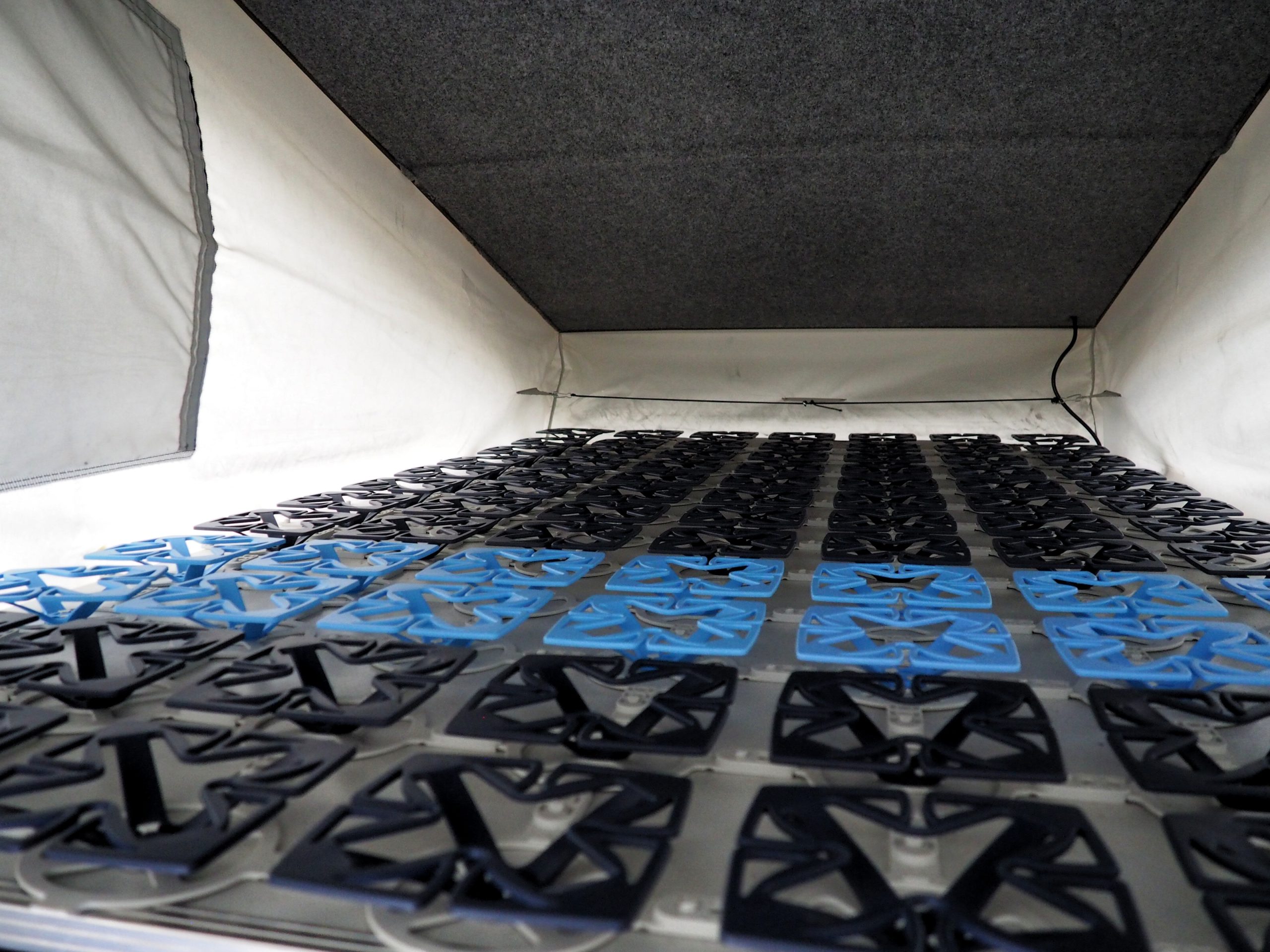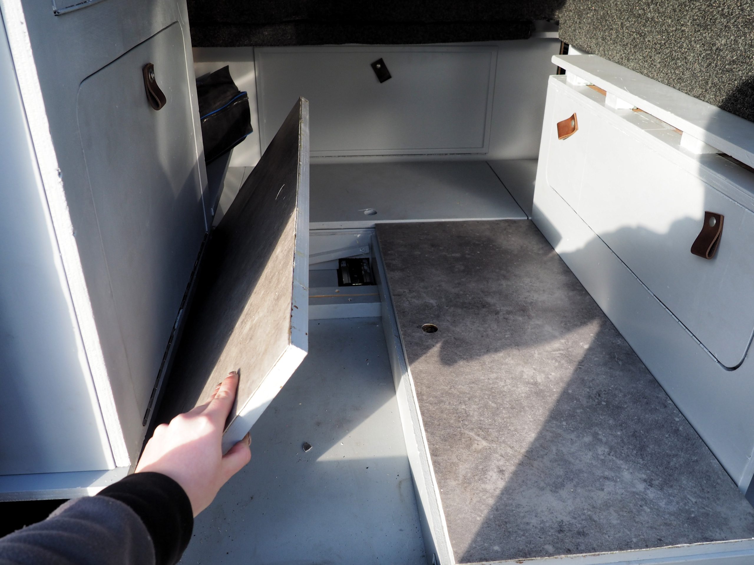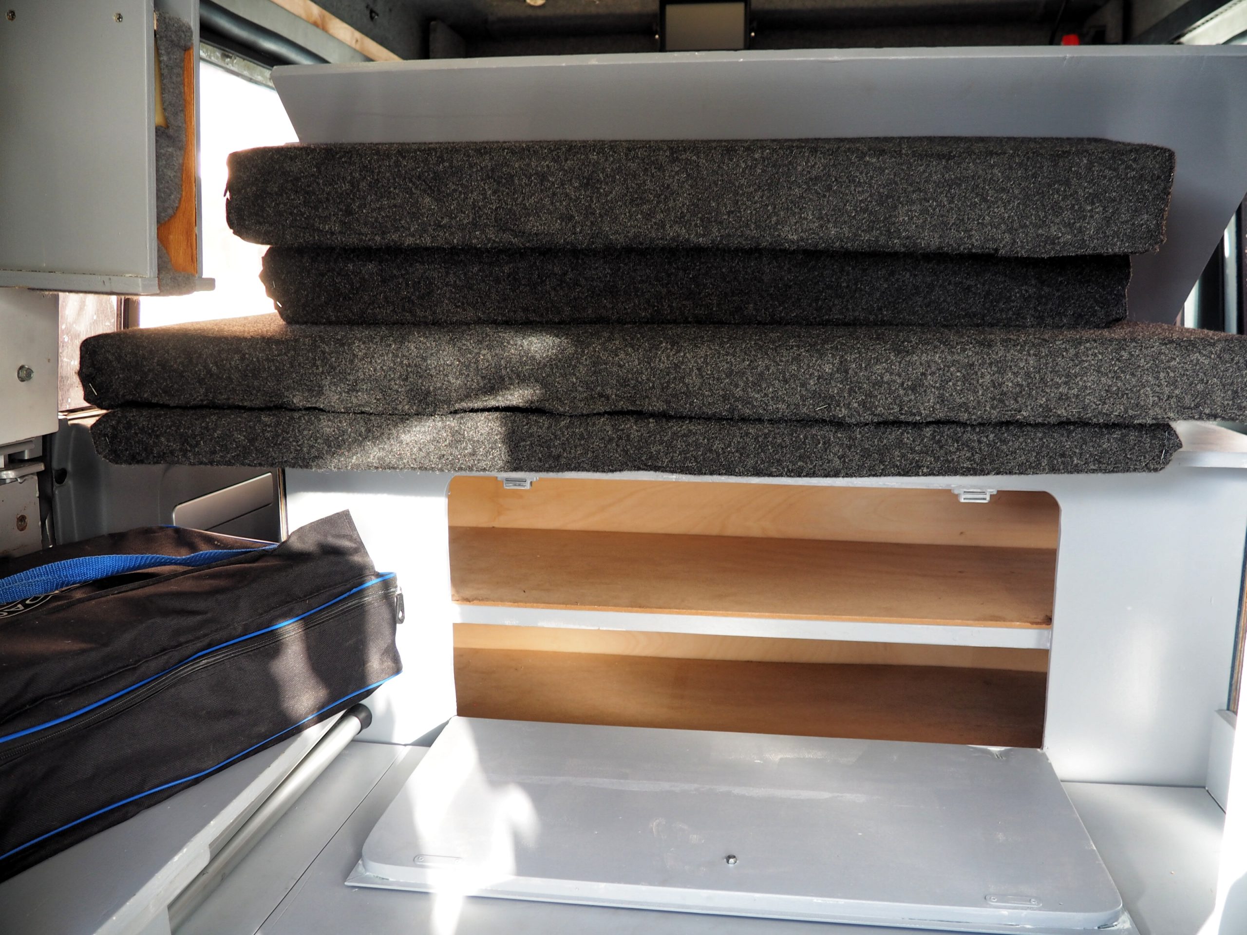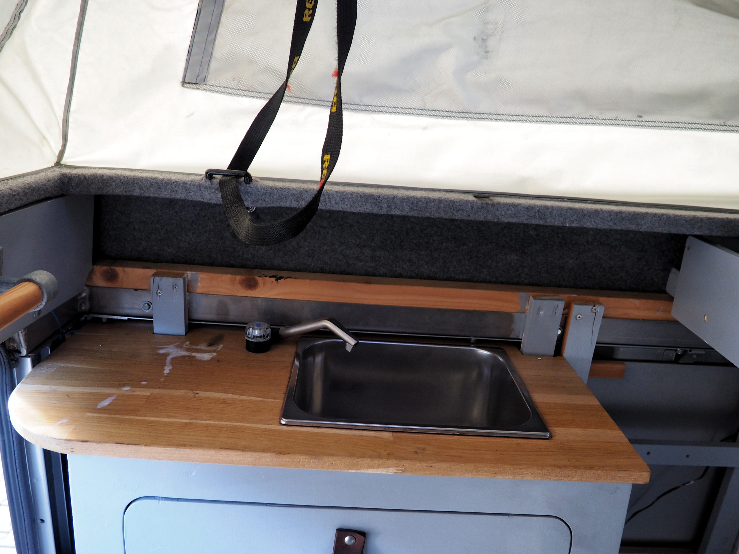 Verder zit er een 2 persoons opklapbaar bed in, hierdoor kun je rechtop kunt staan bij het aanrecht. Het matras en de topper liggen op een Froli Star Mobil bed systeem.